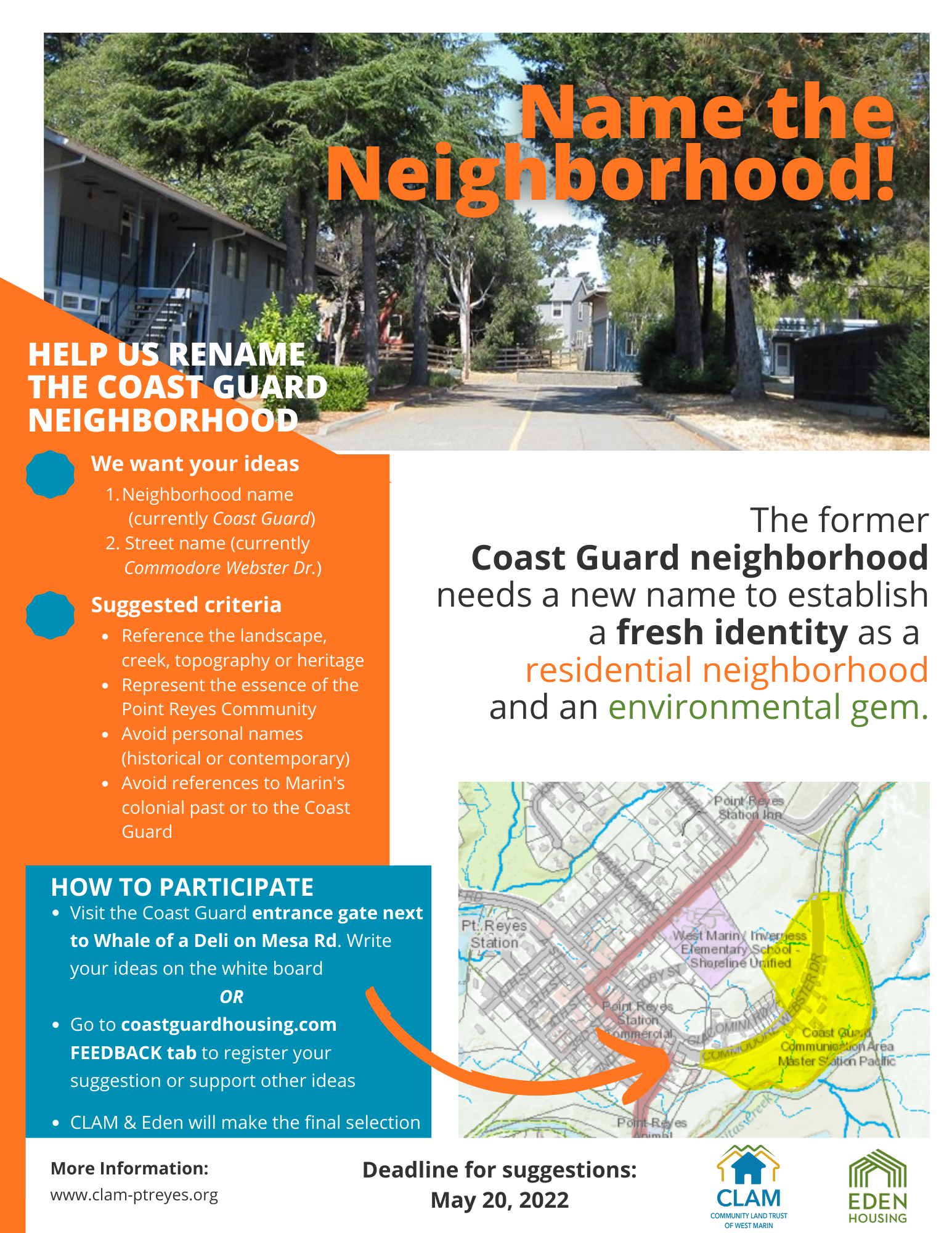 We want your ideas! The former Coast Guard Neighborhood needs a new name to establish a fresh identity as an affordable residential neighborhood, a community amenity, and an environmental gem. Over 20 people have made suggestions on CoastGuardHousing.com, and we're on the lookout for more great ideas.